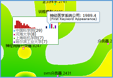 紧随其后是该关键概念的首次出现的时间和申请人,为” 首次发明点”,如关键概念“神经网络分类器”是由神经医学系统公司于1989.4月首次提出,点击”首次发明点”,就可以检索该首次coined这个关键技术的专利申请。