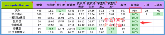 进一步,我们对与CN101541100关联的1000篇专利进行大数据分析。我们发现在该领域里,竞争对手们都是100%维持与CN101541100关联的专利。而且通过数据分析,我们知道华为组专利的质量仅次与爱立信和诺基亚,但高于阿尔卡特朗讯。